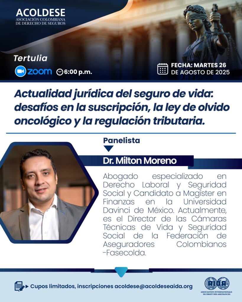 agosto 27, 2025Tertulia 26 de agosto de 2025 – Actualidad jurídica del seguro de vida en Colombia.Tema: Actualidad jurídica del seguro de vida en Colombia. Invitado: Dr. Milton Moreno