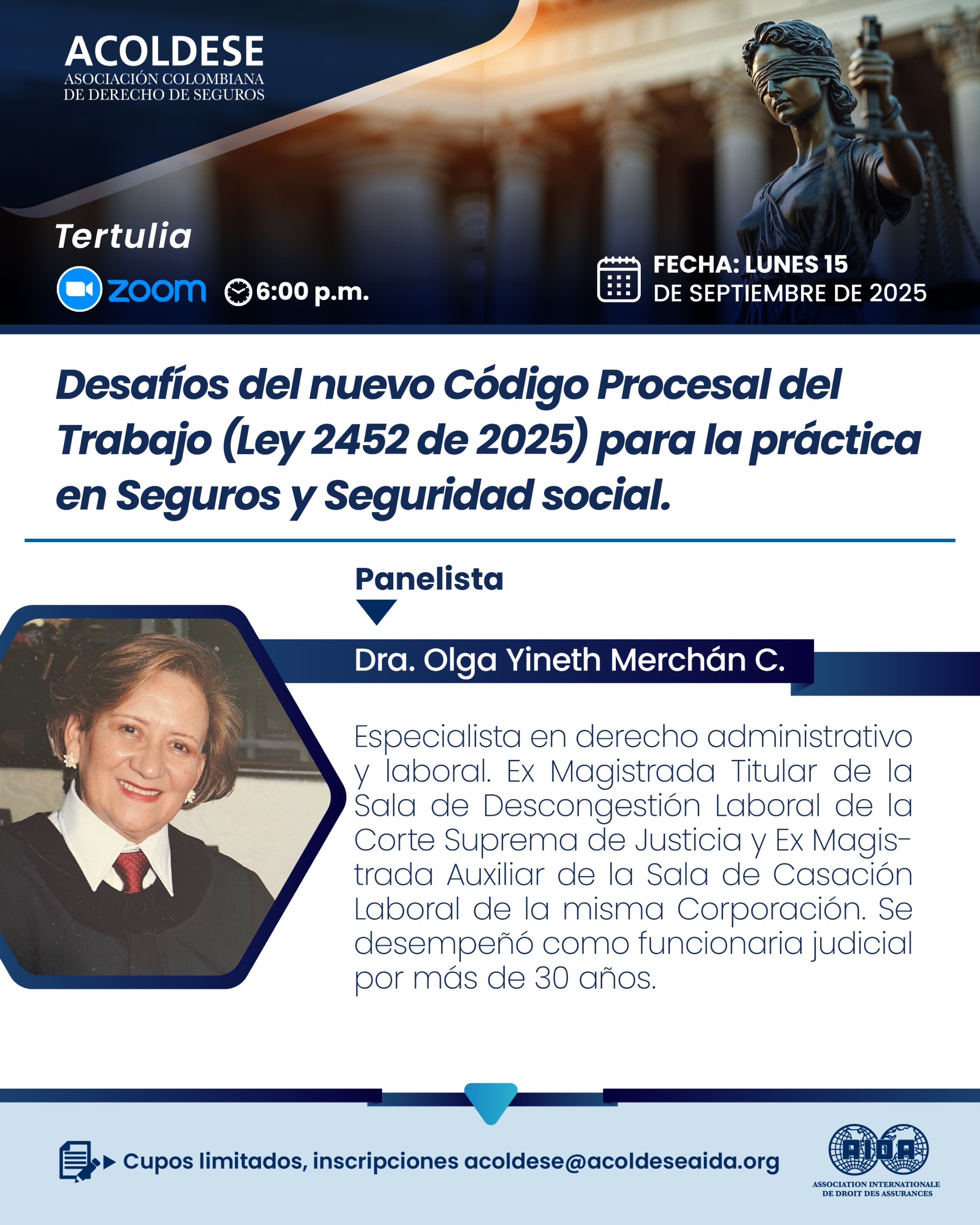 septiembre 16, 2025Tertulia 15 septiembre – Desafíos del nuevo Código Procesal del Trabajo (Ley 2452 de 2025)Tema: Desafíos del nuevo Código Procesal del Trabajo (Ley 2452 de 2025) para la práctica en Seguros y Seguridad Social. Invitado: Dra Olga Yineth Merchan C.