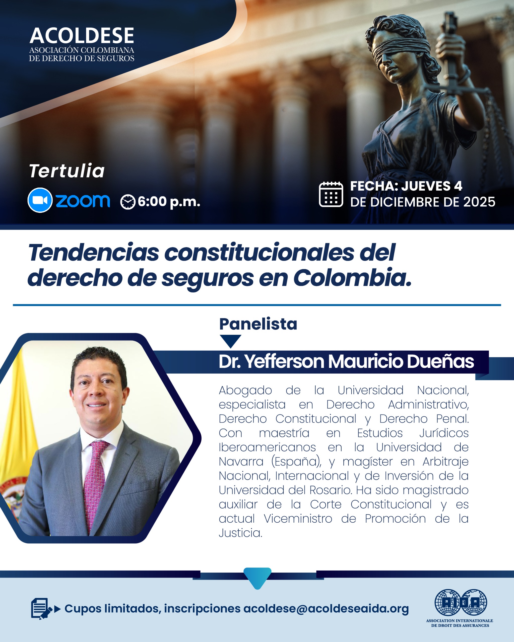 diciembre 10, 2025Tertulia 4 de diciembre – Tendencias constitucionales del derecho de seguros en ColombiaTema: Tendencias constitucionales del derecho de seguros en Colombia. Invitado: Dr. Yefferson Mauricio Dueñas